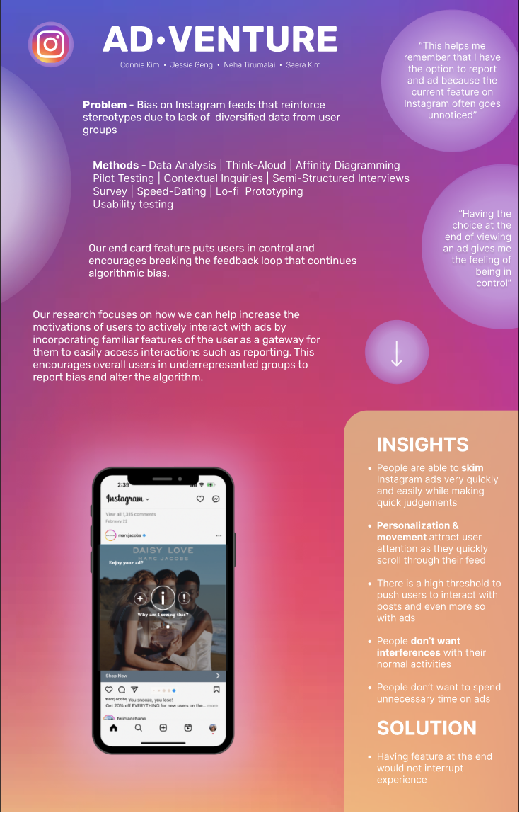 AD-venture is a new design of interfaces for advertisements on Instagram. Instead of the three dots on the right upper corner which requires users to double click and consume time and redundant work on uninterested things, we let the interface reach the user.